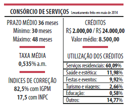 Com 69,4% de participação no Produto Interno Bruto (PIB) em 2013, os serviços configuram um mercado potencial para o Sistema de Consórcios. Levantamento feito com administradoras associadas que atuam no setor revelou que, entre as novas cotas comercializadas, o prazo médio era de 36 meses e o valor dos créditos variava de R$ 2.000,00 a R$ 24.000,00. O crescimento da presença das pessoas jurídicas também foi significativo,com 361,5% de alta nos últimos 12 meses. O percentual de participação desse público saltou de 2%, em maio de 2013, para 9,23% em maio deste ano. Outra pesquisa mais abrangente, da Quorum Brasil, revelou que 65% dos contratantes são mulheres, e que 31% enquadram-se em duas faixas etárias: de 30 a 39 anos e acima de 50 anos. Os consorciados de 40 a 49 anos participam com 23%, e os jovens de 20 a 29, com 15%.