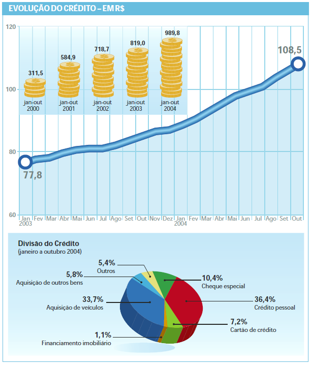 Economia em alta impulsiona o crédito e vice-versa – o aumento da oferta de crédito faz a economia crescer. Uma prova disso está no desempenho de importantes setores industriais, como o automobilístico e eletroeletrônico, que retomaram em 2004 o ritmo de aquecimento. A indústria automobilística, por exemplo, prevê produzir mais 5,4% durante o ano e a de eletroeletrônicos projeta chegar a um índice entre 15% e 20%, na primeira evolução substancial desde 2000, segundo a Associação Nacional de Fabricantes de Produtos Eletroeletrônicos (Eletros). O crédito está em alta em todos os segmentos, exceto financiamentos imobiliários, que recuaram 27,1% na comparação com 2003. O crédito pessoal lidera o compasso de crescimento (mais 33,1%), principalmente como reflexo do crédito consignado com desconto em folha de pagamento. Na seqüência, aparecem o financiamento para aquisição de bens,com evolução de 24,1% – e com impacto no desempenho favorável de eletroeletrônicos – e o financiamento para veículos, com mais 21,8%. Em volume,os empréstimos para a aquisição de veículos consumiram a maior fatia do crédito: 33,7% no acumulado de janeiro a outubro.