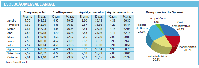 Adicionalmente, nem todo o dinheiro depositado nos bancos pode ser emprestado livremente. Parte obrigatoriamente deve ser direcionada a setores que o governo tem interesse em estimular. Do total de crédito ofertado no Brasil até o mês de outubro, 36% correspondem aos créditos direcionados: 19,8% são do BNDES; 10,7% vão para a agricultura; 5,2% para a habitação; e 0,3% são outros. A inadimplência implica custo, que é repassado ao tomador do crédito, seja ele bom ou mau pagador. Os bancos trabalham com médias históricas de inadimplência e adotam programas sofisticados de acompanhamento de risco de crédito, mas é comum
