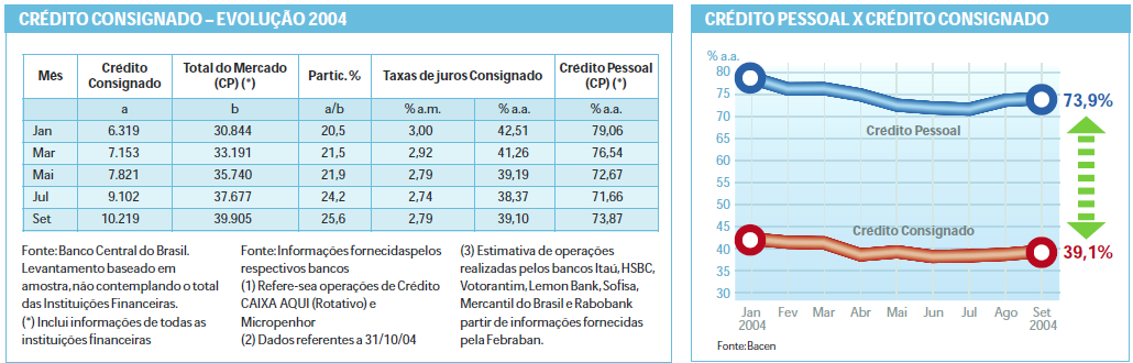 Uma medida de grande impacto na concessão de crédito no Brasil foi anunciada pelo Governo Federal no mês de setembro de 2003: o empréstimo consignado.Ao permitir ao trabalhador abater a dívida diretamente na folha de pagamento, a modalidade reduz o risco para as instituições financeiras, que passaram a oferecer taxas de juros bem mais baixas do que as normalmente encontradas no mercado.A maioria dos acordos assinados entre entidades sindicais e empresas com os bancos que concedem crédito estipulam uma variação da taxa de juros de 1,75% a 3,3% ao mês, para empréstimos com prazo de pagamento de até 36 meses. Além de a medida ter contribuído para a evolução da concessão de crédito pessoal no país em 2004, também ajuda a melhorar o perfil da dívida dos brasileiros, que solicitam empréstimos para quitar compromissos cujas taxas de juros são muito altas. Isso porque o crédito consignado proporciona taxas até dois terços menores do que as aplicadas em outras modalidades de crédito. Segundo o Banco Central, em outubro a taxa de juros anual média dos empréstimos com desconto em folha de pagamento foi de 39,12%. Já a taxa média anual do cheque especial, em outubro, ficou em 73,82%. No mesmo mês, segundo o Banco Central, a concessão de crédito consignando atingiu a marca de R$ 10, 9 bilhões no acumulado do ano,o que representa uma evolução de 73% no período entre fevereiro e outubro (em janeiro, acumulava R$ 6,3 bilhões). Com o resultado, a modalidade passou a representar aproximadamente 2,3% do volume global de empréstimos do sistema financeiro nacional.