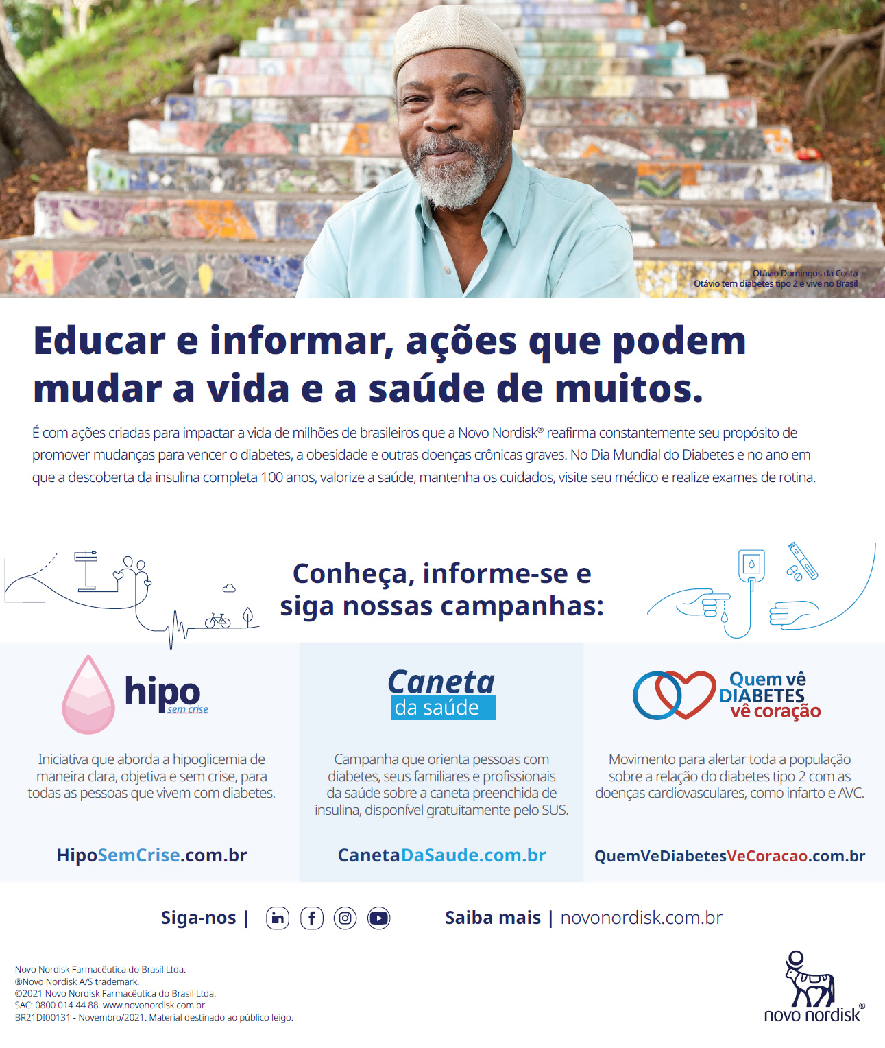 No Brasil, a campanha é realizada nacionalmente pela Federação Nacional de Diabetes (Fenad) e, em São Paulo, pela Associação Nacional de Atenção ao Diabetes (Anad). O presidente de ambas, Fadlo Fraige Filho, médico endocrinologista, professor titular emérito da Faculdade de Medicina do ABC e presidente eleito para o biênio 2022 e 2023 da região para a América Latina do IDF, aponta a relevância de promover a conscientização e destacar a magnitude do Diabetes. Para isso, apresenta dados alarmantes sobre a enfermidade. “São mais de 450 milhões de pessoas com a doença, que é altamente prevalente e incidente. É uma doença metabólica e que, por isso, pode não chamar a atenção, levando à falta de adesão ao tratamento. Dos 450 milhões de portadores, 90% têm a enfermidade do tipo 2, que é exatamente a mais imperceptível e, por isso, chamada de doença silenciosa.”