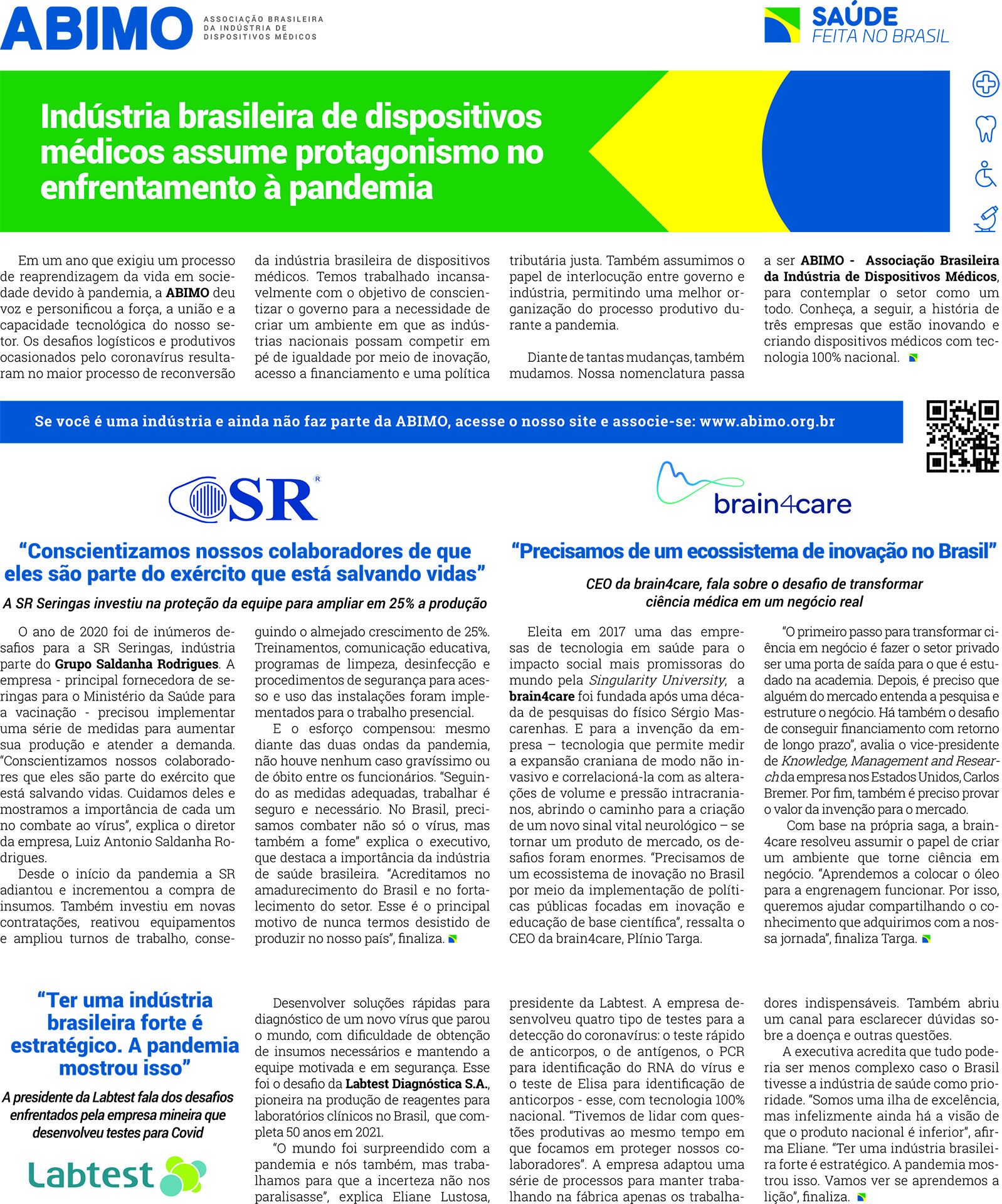 Segundo o presidente da Associação Brasileira da Indústria de Artigos e Equipamentos Médicos, Odontológicos, Hospitalares e de Laboratórios(Abimo), Franco Pallamolla, o mercado de equipamentos, no Brasil, está entre os dez mais importantes do mundo, tanto em tecnologia quanto em qualidade. “O enfrentamento da pandemia do coronavírus mostrou toda a nossa capacidade de resposta às demandas que se apresentaram e ainda se apresentam. Fomos ágeis, eficientes e inovadores, atendendo às mais variadas solicitações, incluindo Equipamentos de Proteção Individual (EPIs) e ventiladores pulmonares”, defende.