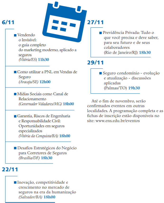 os atendem. Nesse sentido, a Escola Nacional de Seguros está promovendo palestras em diversas regiões do país, a fim de difundir o conhecimento sobre o mercado de seguros e alcançar os mais diferentes públicos.