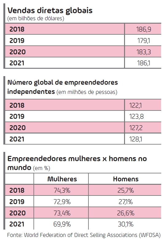 A World Federation of Direct Selling Associations (WFDSA), organização que representa a indústria global de vendas diretas em mais de 170 países, defi ne o modelo de negócios como sendo um canal usado pelas principais marcas globais e pequenas empresas empreendedoras para comercializar produtos e serviços dos mais variados tipos, incluindo joias, utensílios de cozinha, alimentos, cosméticos, utilidades domésticas, energia e seguros, entre outros, aos consumidores. Se por um lado ele permite o acesso a soluções de alta qualidade como no varejo convencional, por outro, suas singularidades incluem as de impulsionar a mentalidade empreendedora e possibilitar a milhões de pessoas ao redor do mundo trabalharem de forma independente. Vendas diretas abrem espaço para que cidadãos constituam seus negócios com baixos custos e liberdade de gestão, fundamentados em estreitos relacionamentos com clientes (por meio de discussões, demonstrações face a face e, mais recentemente, por meio da internet e/ou redes sociais). A mesma WFDSA estima que, no mundo, apenas em 2021 (dado mais recente disponibilizado pela Federação), o setor movimentou 186,1 bilhões de dólares, e que naquele mesmo ano, 128,1 milhões de pessoas atuaram como empreendedores independentes no planeta.