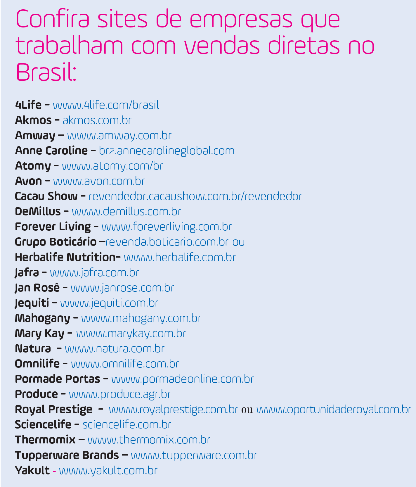 Finalmente, se o assunto é vestuário, uma empresa tradicional no setor de vendas diretas é a DeMillus, com mais de 75 anos de história e líder no mercado de consumidores de lingerie. Para revender os produtos da marca é preciso ter mais de 18 anos e passar por uma análise interna do cadastro. Não há necessidade de fazer um investimento inicial em peças, embora a empresa recomende alguns itens campeões de vendas que servem como mostruário inicial aos clientes.